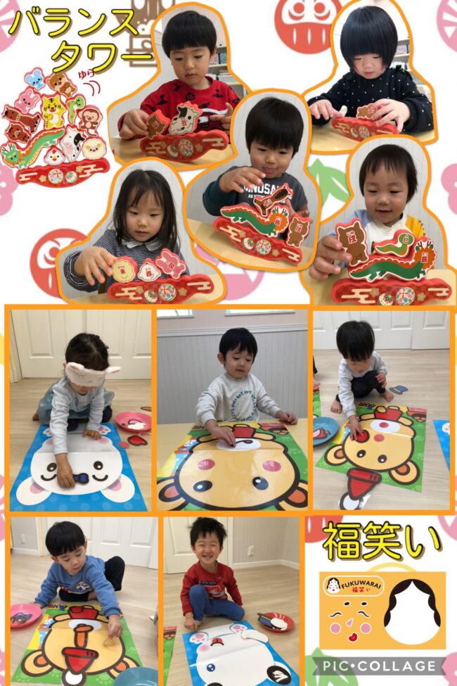 干支のバランスタワーでは、十二支の動物たちを落ちないように工夫をしながら取り組んでいたり、福笑いでは、目隠しをしながら目や口のパーツを置いて、面白い顔が出来上がるとみんなで「面白いお顔になったね」と笑い合って楽しんでいました。