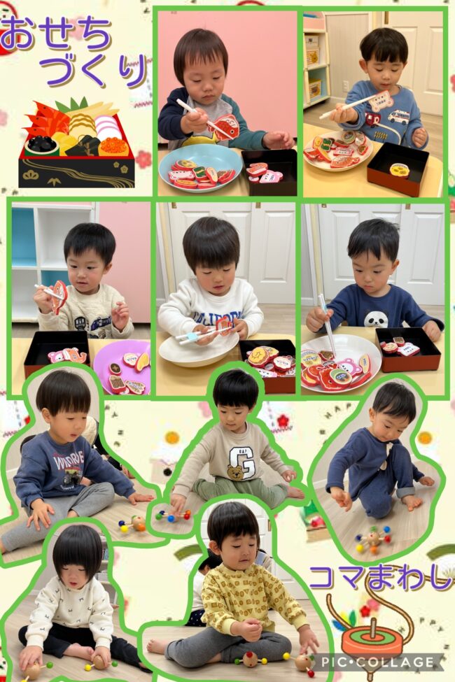 1月ということで、お正月の楽しいシアターを見たり、おせち作りやこま回し・干支のバランスタワー・福笑いの伝承遊びをしました。