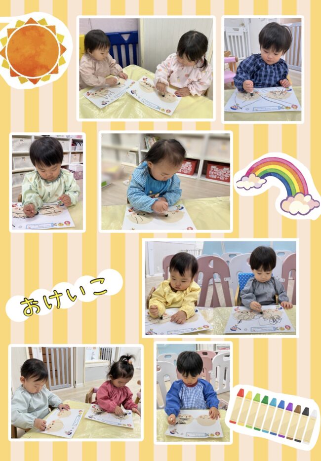 用紙を見て、りす組・ひよこ組のみんなは「あれ?かみのけがないね」とすぐに気づいて教えてくれました。みんなで「どんなかみがたにしような」とお話ししながら楽しくお絵描きをしました。クレヨンをギザギザ、クルクルと自由に動かし髪の毛を表現したり、トントンと紙に押し付けて音や感触を楽しむ姿がありました。完成すると、「かみのけできたね」と嬉しそうな子どもたちでした。
