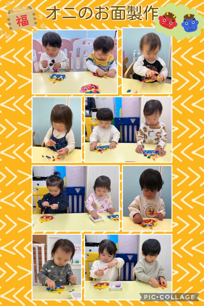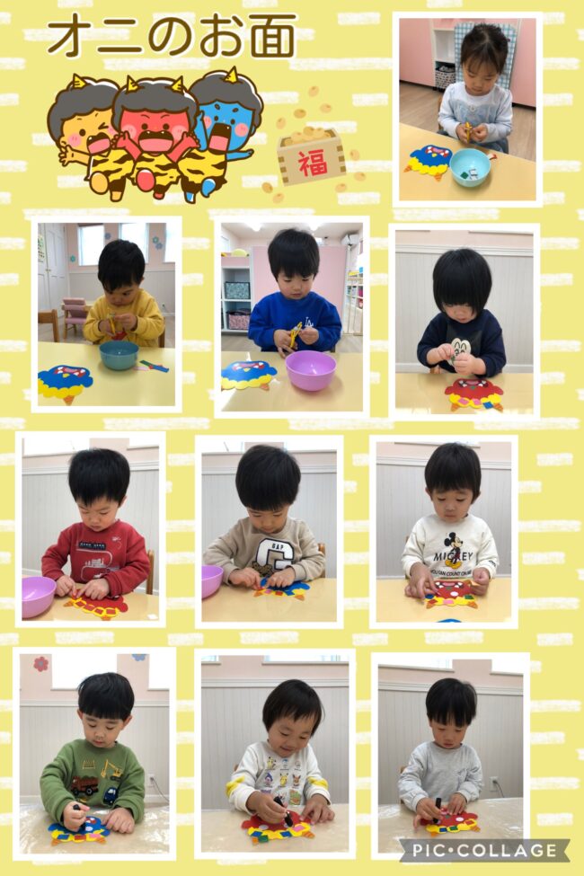 自分で作ったオニのお面を見ながらにっこりと笑い節分イベントが待ち遠しい様子の子どもたちでした。