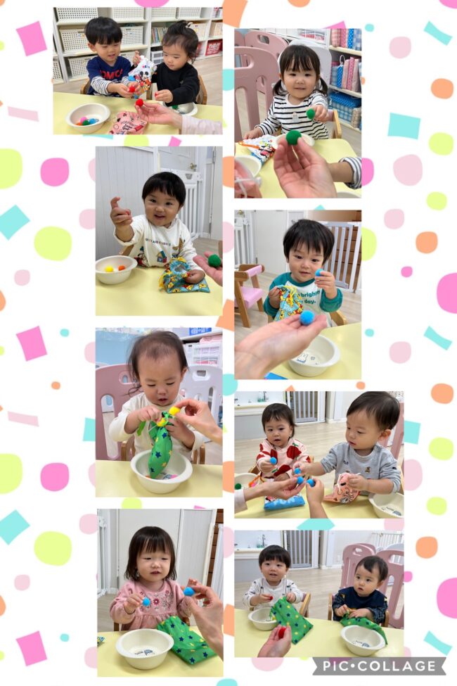 袋の中から好きな色を取り出すお友だちや、保育者が持つ色をよく見て同じ色を見つけることができたお友だち、それぞれの楽しみ方で取り組むことが出来ました。