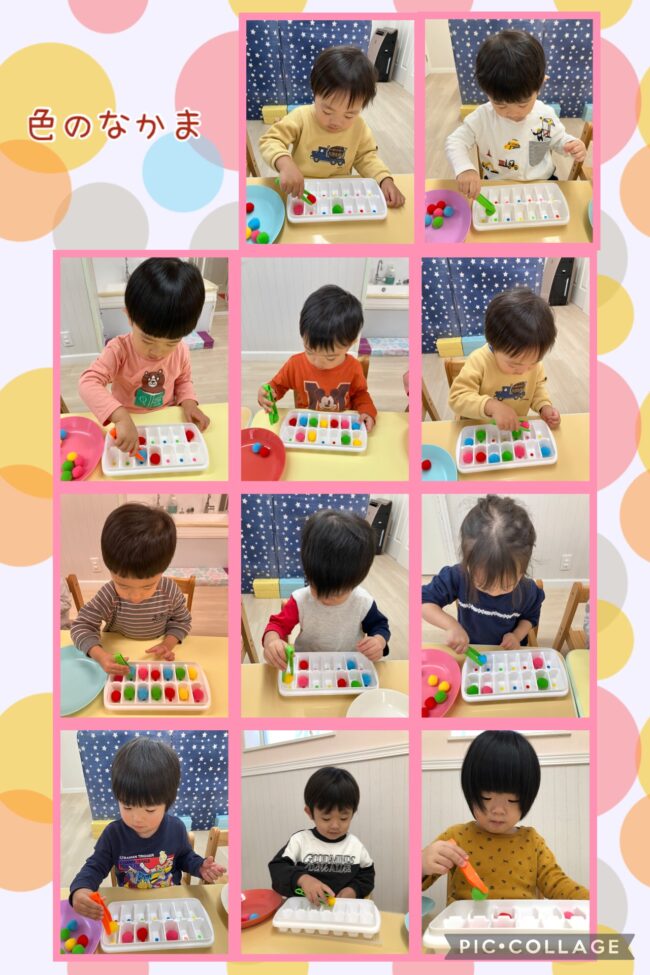 子どもたちは、色の違いに気づき、物を指さしながら「これは、きいろ」「あか」と口に出し、ケースに貼ってある同じ色のシールを見つけて入れていくことを楽しんでいました。