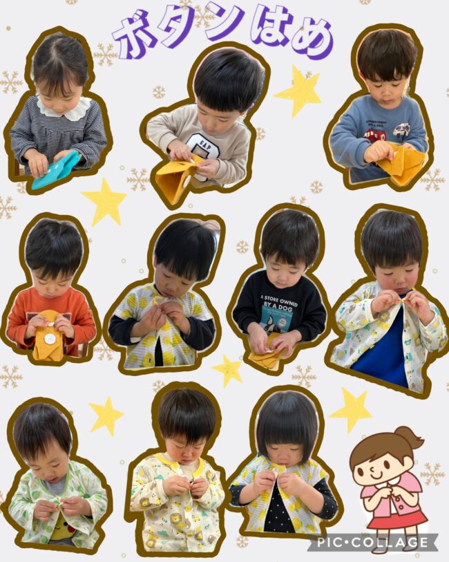 指先の器用さが発達してきた子どもたちは、3本の指をつかいボタンを細い穴にくぐらせる動作ができるようになってきました。