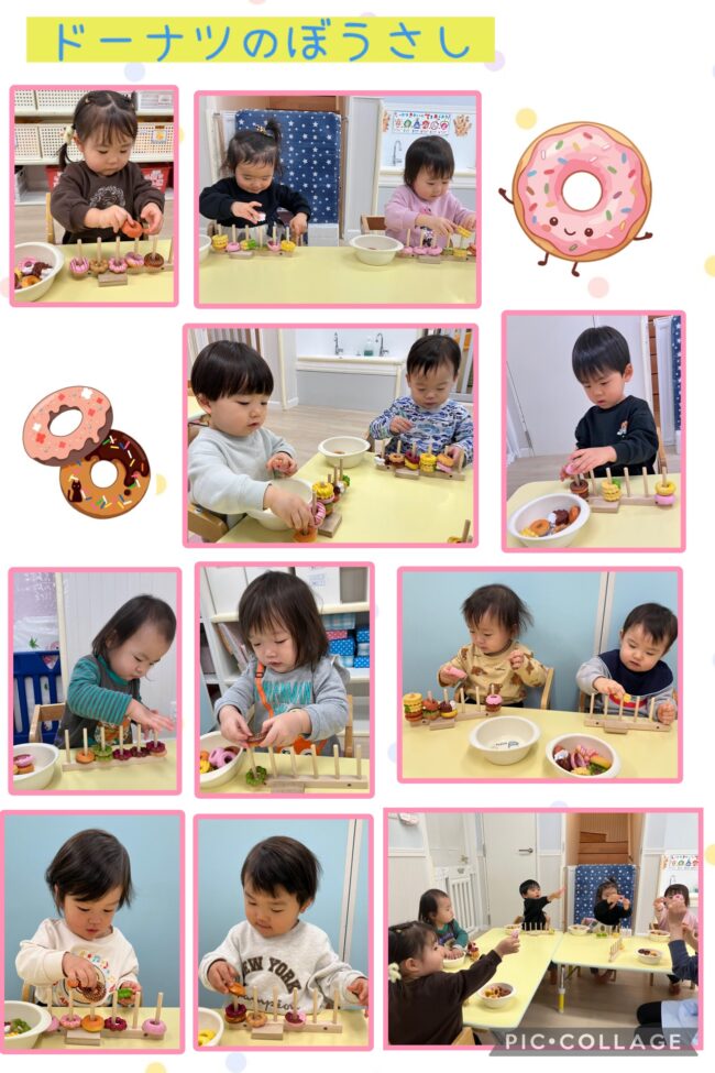 6本並んだ棒差しの土台にドーナツリングを入れていく遊びです。棒に好きなドーナツを入れたり、保育者が伝えた数のドーナツをいれたりするなど保育者と数や色のやり取りを楽しみながら取り組みました。