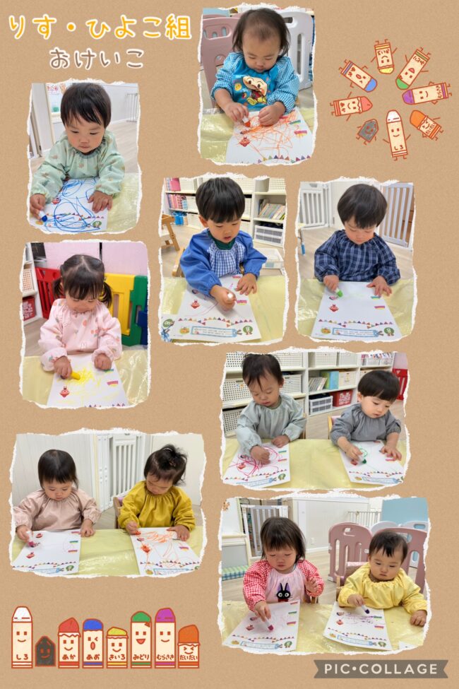保育者の声掛けを真似して「くるくるくる〜!」と言いながら円を意識して手を動かすことができるお友だちや、大きくギザギザと動かしてお絵描きを楽しむお友だちも、みんな元気いっぱいに描くことができました。