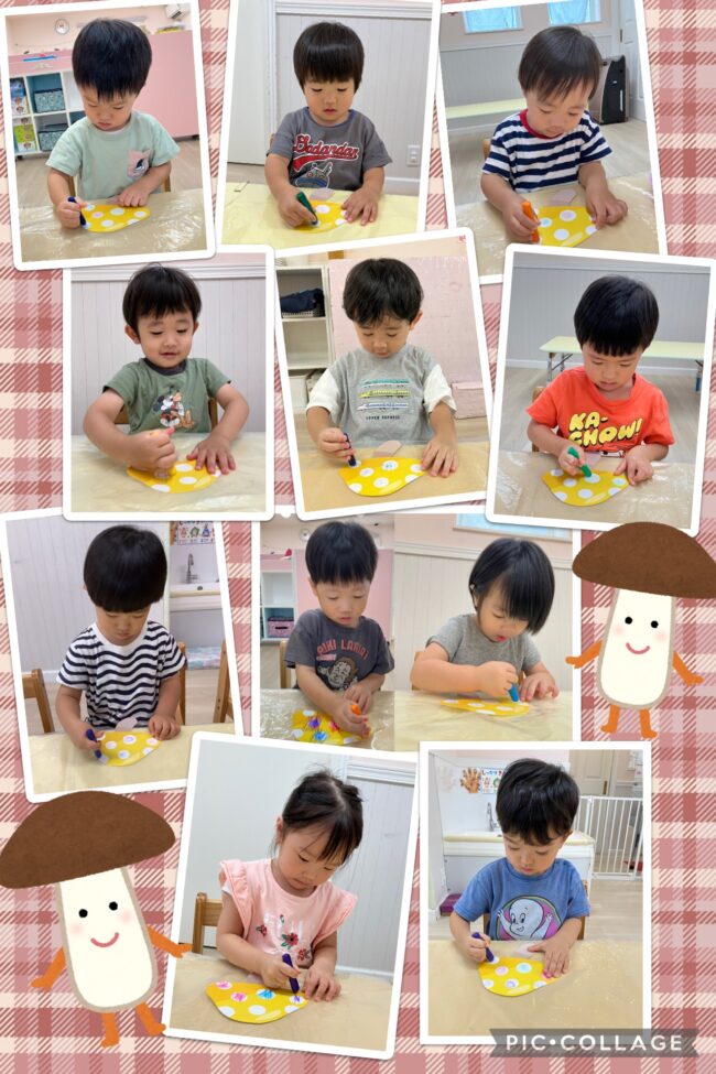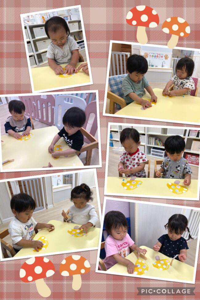 りす、ひよこ組さんは、きのこにシールを貼りました!