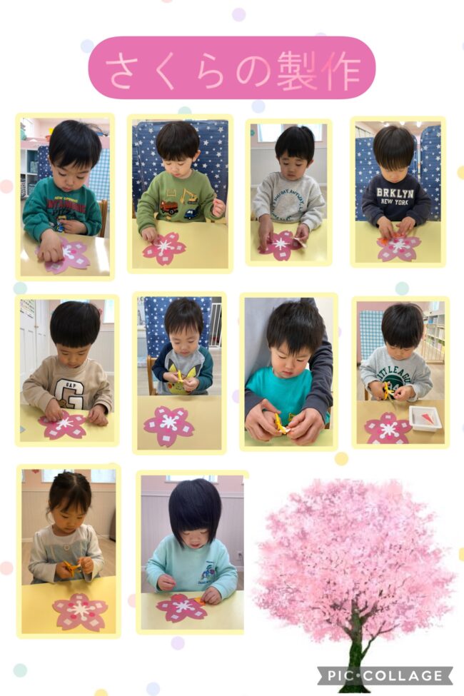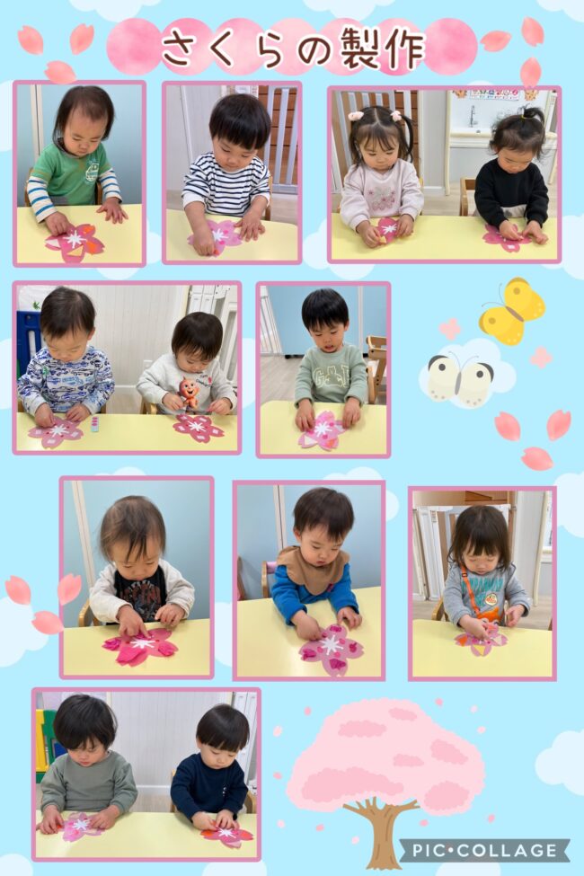 桜の製作をしました。三角の折り紙を花びらに見立てて台紙に貼ったり、雌しべの部分にピンクの丸シールを貼って作りました。折り紙は光沢があり、ツルツルした素材だったため、指で触ったりして感触を楽しみながら貼り付ける姿がありました。丸シールを貼り付ける位置に赤い丸印があり、そこに貼るように指差して伝えると、上手に狙って貼り付ける姿がありました。保育室に飾り自分の桜を探したり、みんなで綺麗だねと楽しみました。