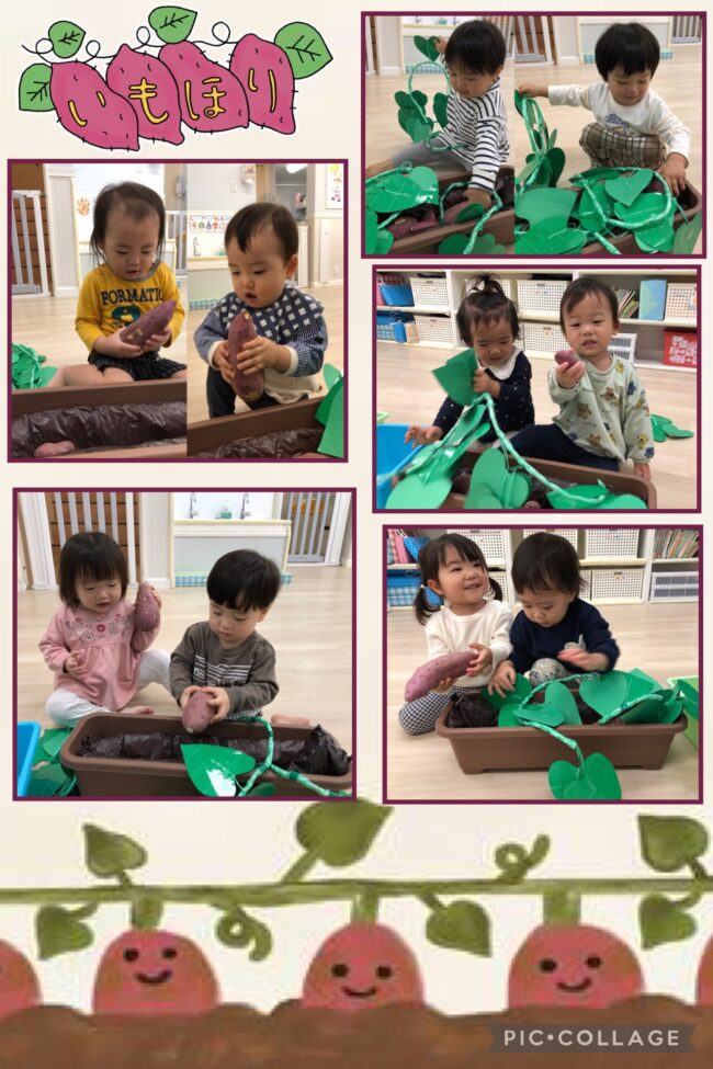 ひよこ・りす組は、保育室の中でお芋掘りを楽しみました。プランターから見えるツルを引っ張り、隠れているお芋を探しました。お芋が出てくるとにっこり嬉しそうな表情を見せる子どもたちでした。大きなお芋や小さなお芋、たくさん表面を触って感触を楽しみました。