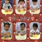 好きな色の模様のきのこやカラフルなきのこが出来上がり、完成すると左右に踊らせるように動かしたりまっすぐに生やしたりして、きのこを動かして生き生きと楽しんでいた子どもたちでした♪