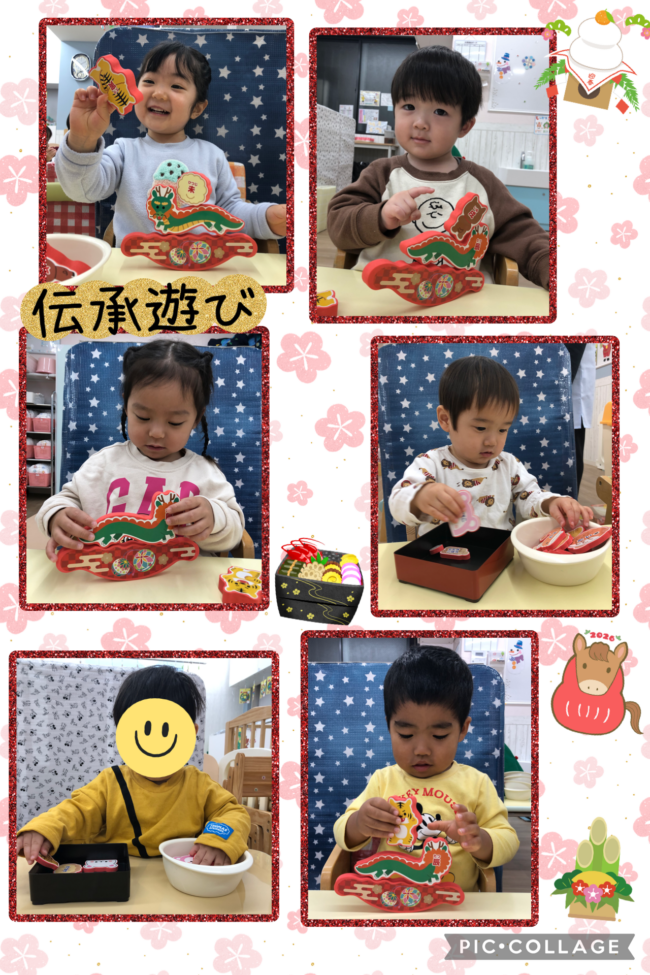 今週は、伝承遊び【おせち作り】【福笑い】【干支バランスタワー】【コマ回し】を