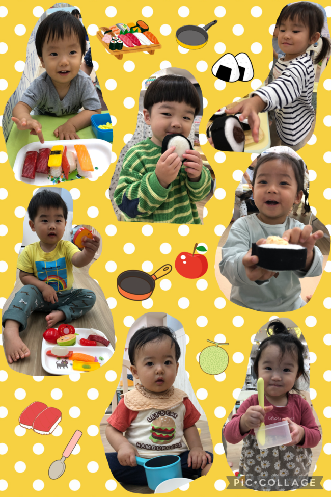 おままごと遊びでは、好きな食べ物をお皿いっぱいに盛り付けたり、お友だちや保育者にリクエストを聞いてお料理をしたり、思い思いに楽しんでいます♪