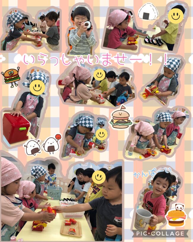おにぎり屋さん、ジュース屋さん等のお店屋さんごっこでは、店員さんとお客さんにグループ毎に分かれて遊びに取り組んでいます。