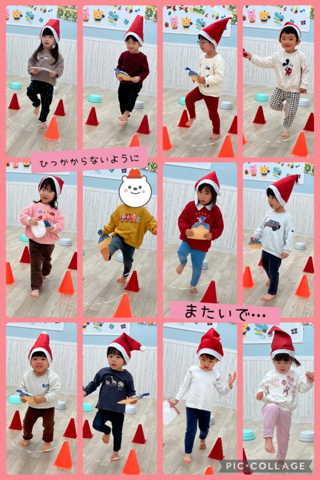 クリスマスサーキットでは、サンタの帽子を被ってプレゼントを手に持ち落とさないように運びます。ウェーブ平均台を落ちないように進んだり足を高く上げてゴム紐に引っかからないように慎重に進みながら楽しんでいました。