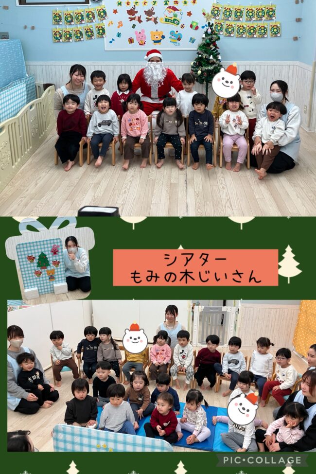 シアター『もみの木じいさん』では、もみの木じいさんが起きないように一緒に人差し指でシーっとして静かに集中して見ていました。