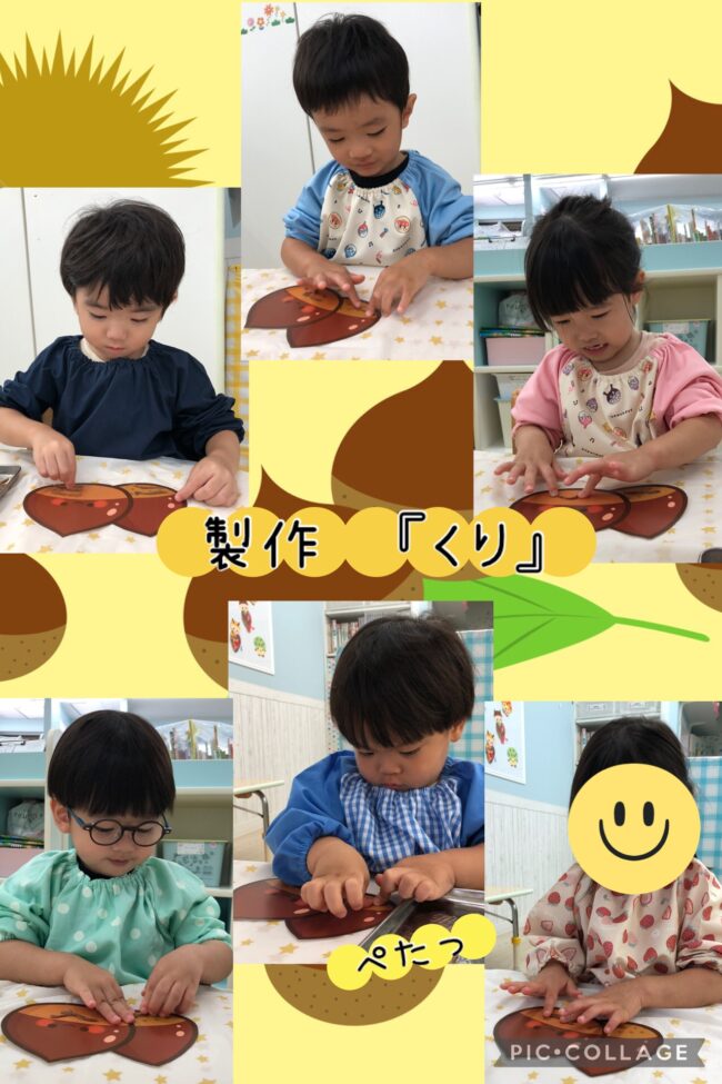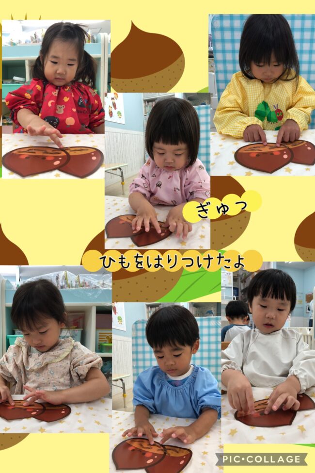 ノリに浸した麻紐をくりのお腹につけて横線の模様を表現しました。横向きにつけようね。と伝えていたので、「よこ」を意識しながら次々に貼り付けることを楽しんでいました。均等に貼り付ける子、沢山貼り付ける子と個性豊かな栗が完成していました♪