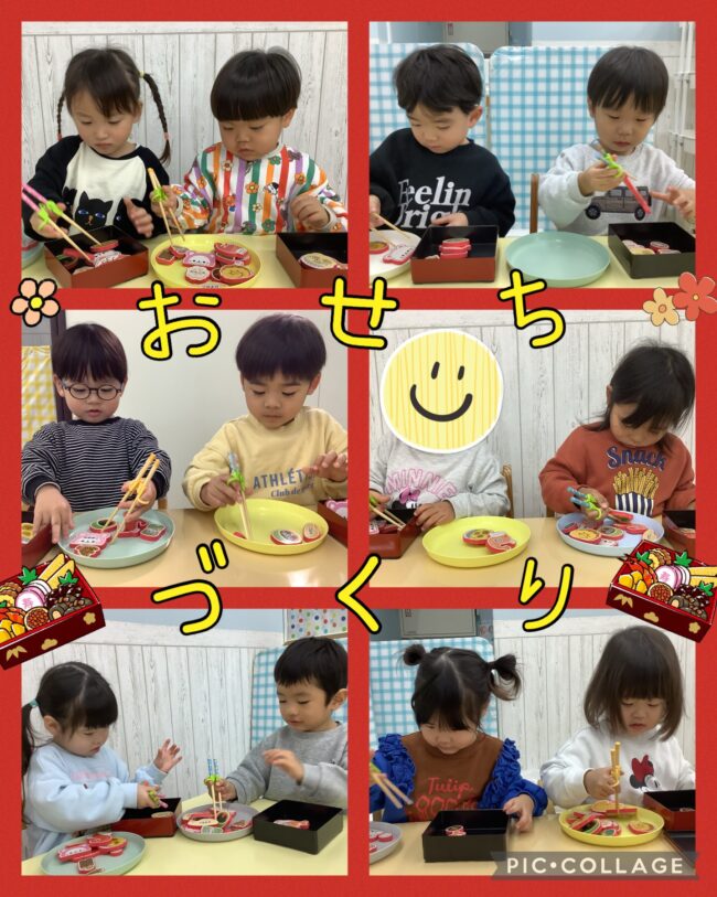 伝承遊びの中でお箸を使うので、少し前からお箸の練習していたうさぎさん。みんなお箸に興味を示し、持ち方も自分から「こう?あってる?」と確認しながら遊んでいました。ポンポンやおせち(スポンジ)を掴めるたび、とても嬉しそうに保育者に知らせていました✯