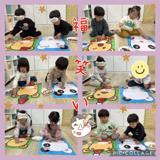 福笑いでは、目隠しをして目や鼻を置いてみたり、実際に見ながら好きなパーツを置いたりして楽しみました♪