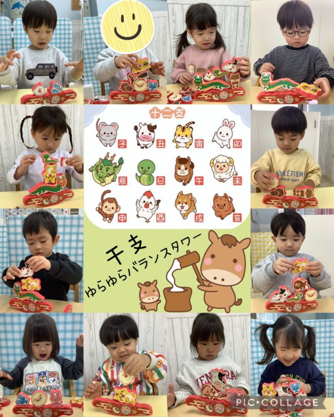 また、干支の動物のゆらゆらバランスタワーでは、たくさんの動物を集中して積み上げて楽しみ、最後は今年の干支の動物のお話をみんなで楽しみました♪