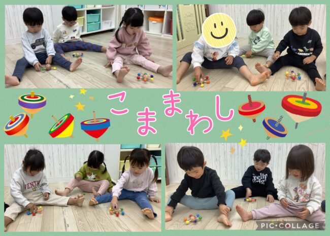 コマ遊びではお友だちとどっちが長く回せるか競争して楽しむ様子が見られました。