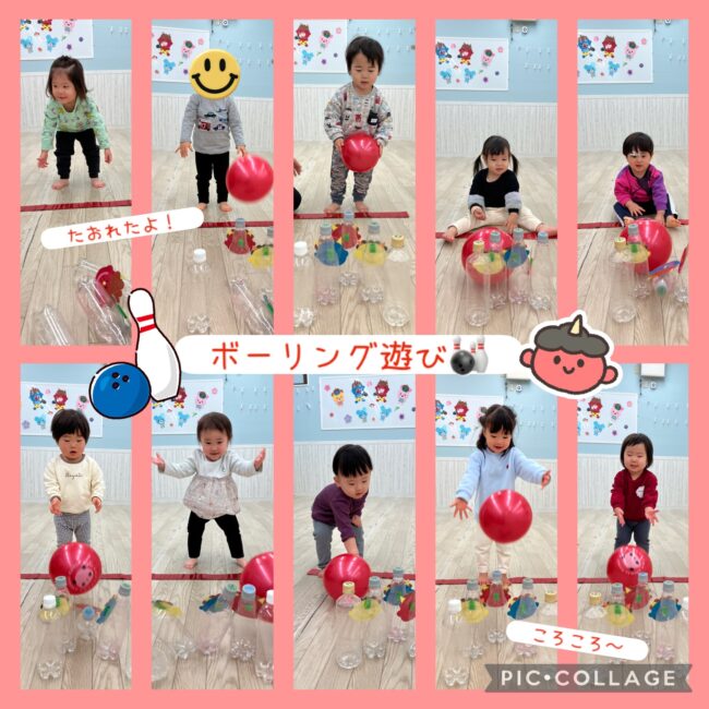 赤鬼さん、青鬼さんめがけてボールを転がしてね、と伝えると「あかおにさんする!」と指を差して狙いを定めていた子どもたち。「せーの」の合図で思い切りボールを転がしてピンが倒れると嬉しそうに笑っていました。