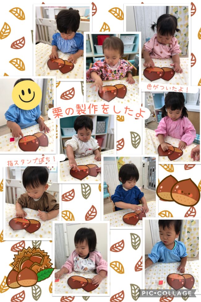 素敵な栗が完成すると、保育者に嬉しそうに見せたり、(早く壁に飾りたいな)と壁面を指差しながらにこにこ笑っていました。