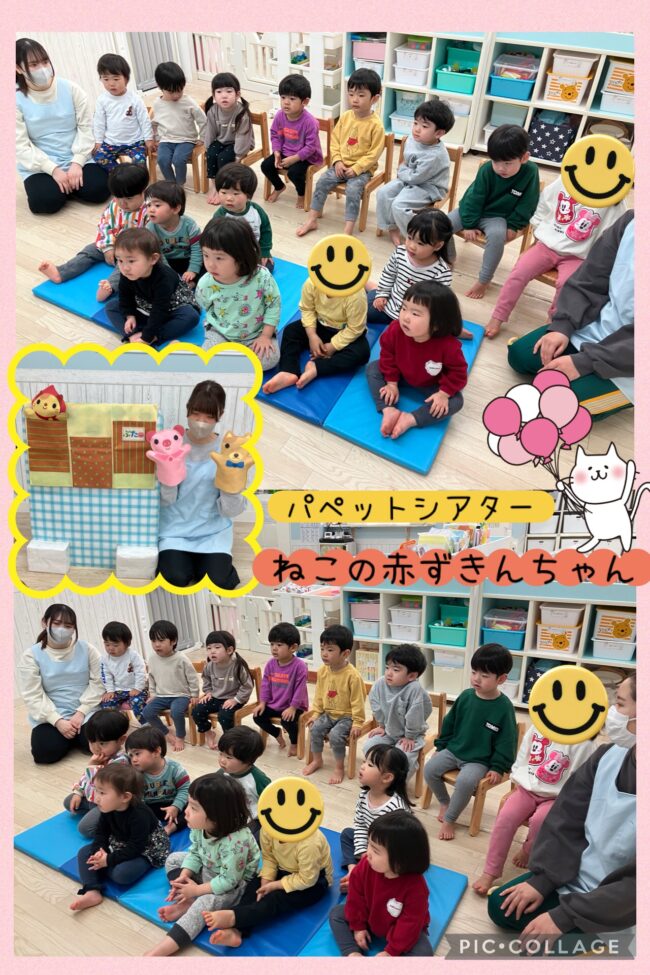 保育者の出し物のパペットシアターでは、【ねこの赤ずきんちゃん】の物語を鑑賞し、「ねこさんが赤ずきんちゃんだ」「オオカミがくるよ」などと知っている赤ずきんちゃんのお話を思い出してお話ししながら楽しんで観ていました☆