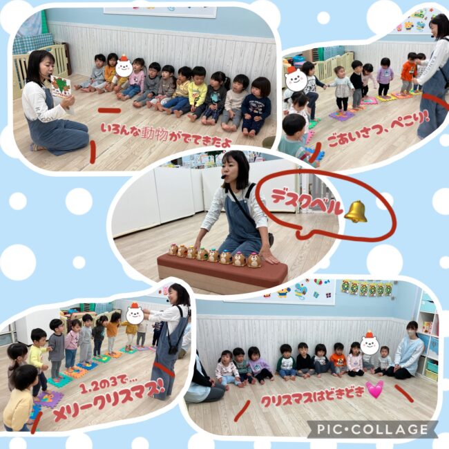 今月のリトミックでは、クリスマスにちなんだ遊びをしました。